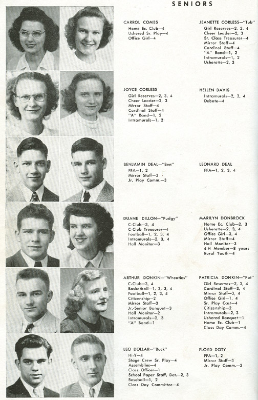 Carol COMBS, Jeanette CORLESS, Joyce CORLESS, Helen DAVIS, Benjamin DEAL, Leonard DEAL, Duane DILLON, Marilyn DONBROCK Arthur DONKIN, Patricia DONKIN, Leo DOLLAR, Floyd DOTY