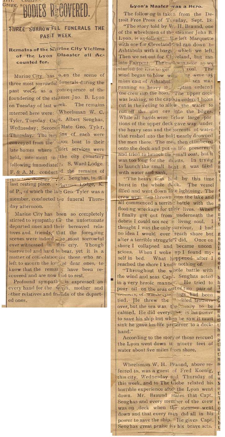 Marine City has been the scene of three most sorrowful funerals during the past week, as a consequence of the foundering of the steamer Jno. B. Lyon on Tuesday of last week. The remains interred here were: Wheelsman W. C. Tyler, Tuesday; Capt. Albert Senghas, Wednesday; Second Mate Geo. Tyler, Thursday. The remains of each were conveyed from the (---on) boat to their late homes where short services were held, interment in the city cemetery following immediately. S. Ward Lodge F. & A. M. conducted the remains of their late Brother Capt. Senghas, to it last resting place. Fortress Lodge, K. of P., of which the late Geo. Tyler was a member, conducted the funeral Thursday afternoon.