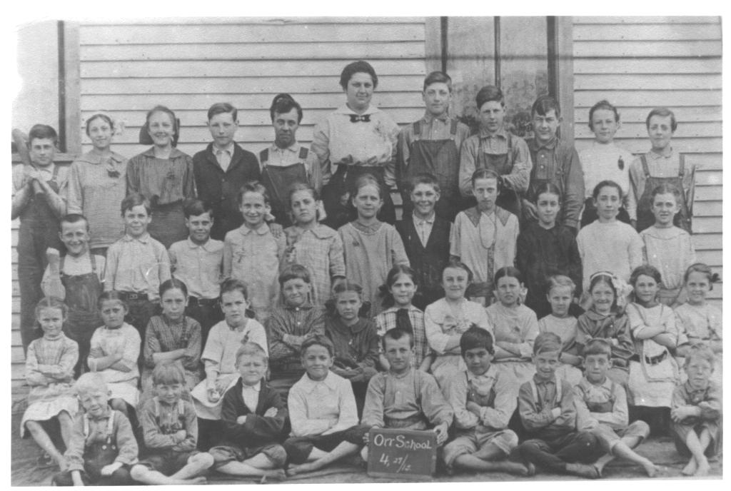 Back Row: Jake Methner, Cleo King, Amy Wilt, John McComb, Howard King, Miss Matilda Downer (teacher), Clarence Haines, Paul Katenhus, Earl Dooley, Noreen Carrick and Ernest Haines