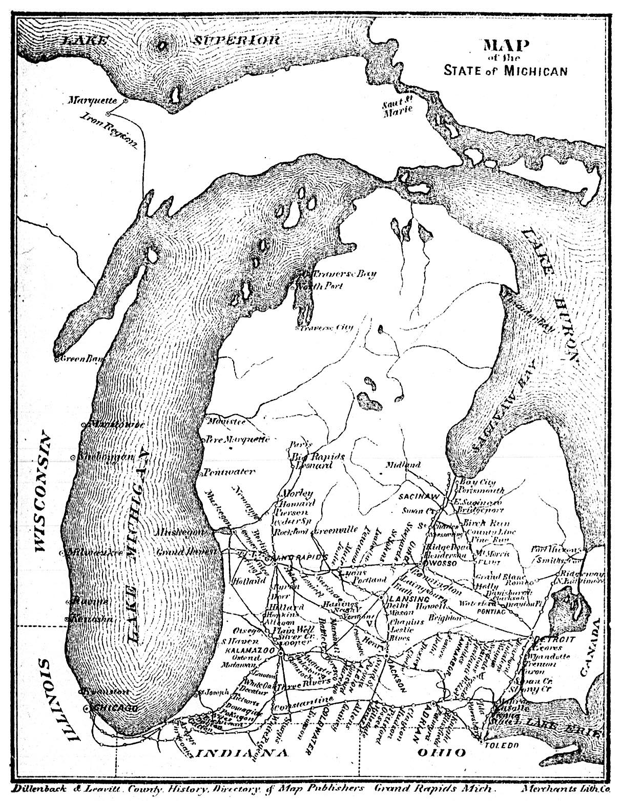 Depicts the expansion of railroad routes throughout the state. From the 1870 Directory of Kent County.
