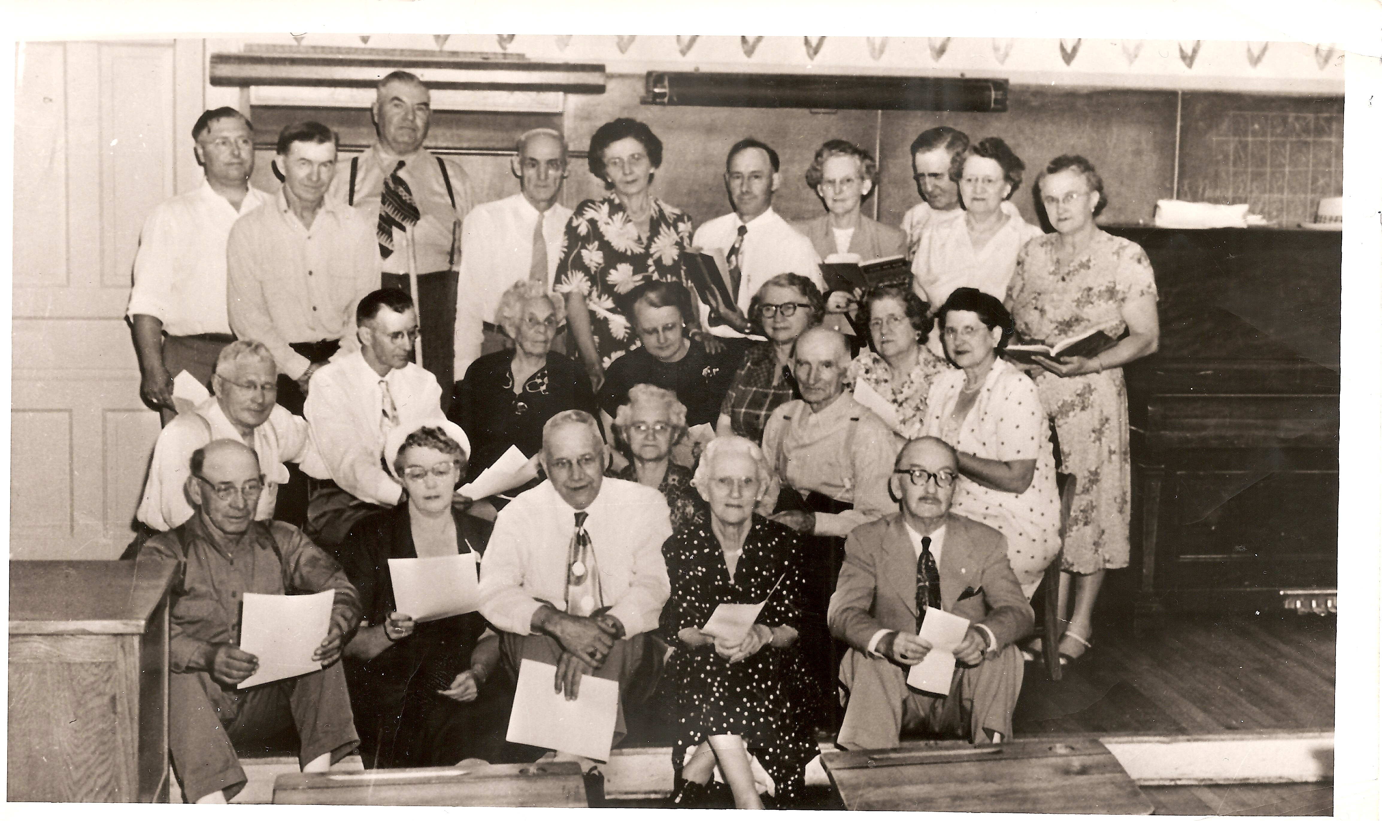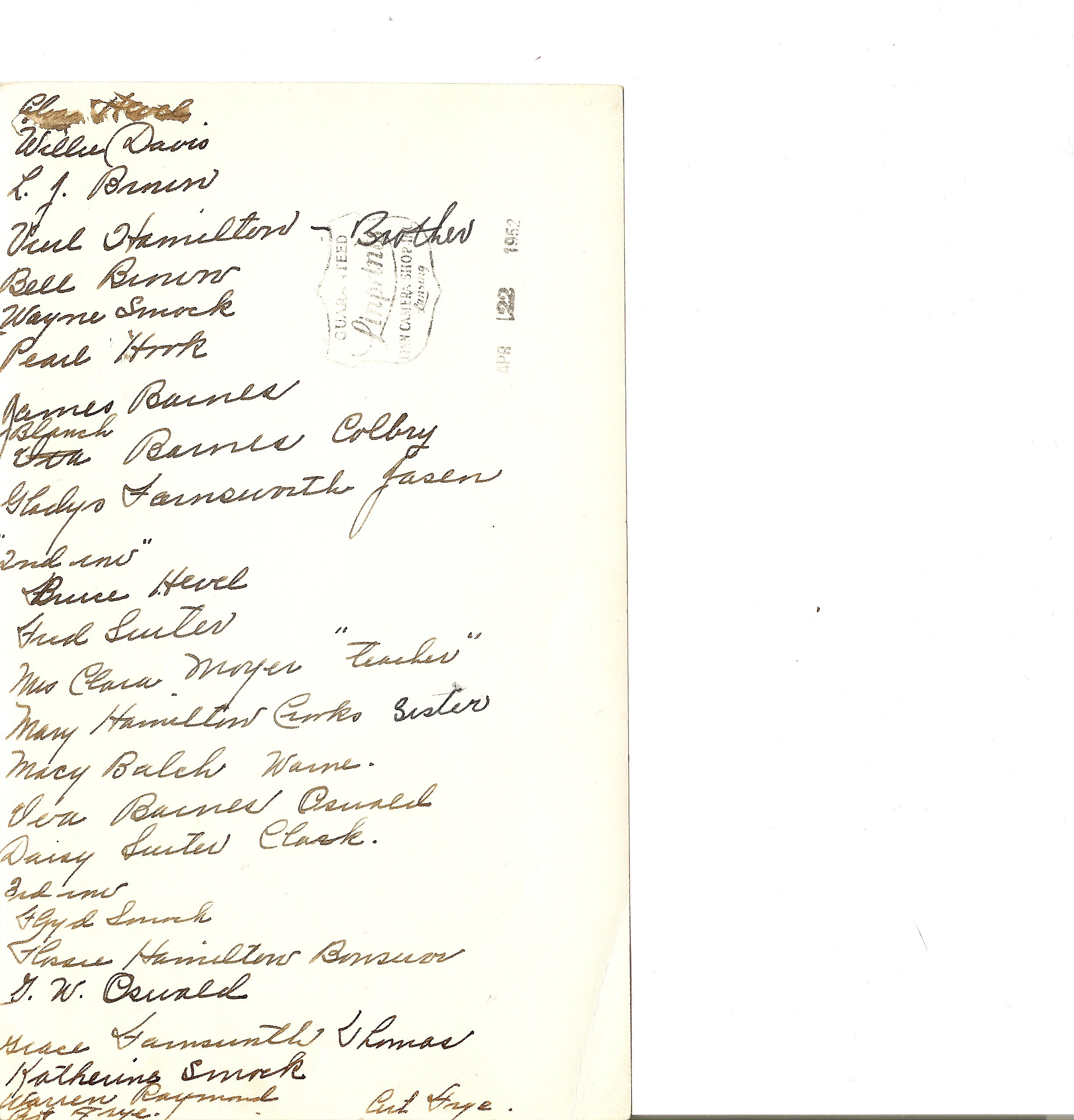 Attendees names on the back of the photo of Brown School Reunion, (about April 1952) were written by Florence Hamilton Bonsour/Nichols/Suiter/Taylor:
