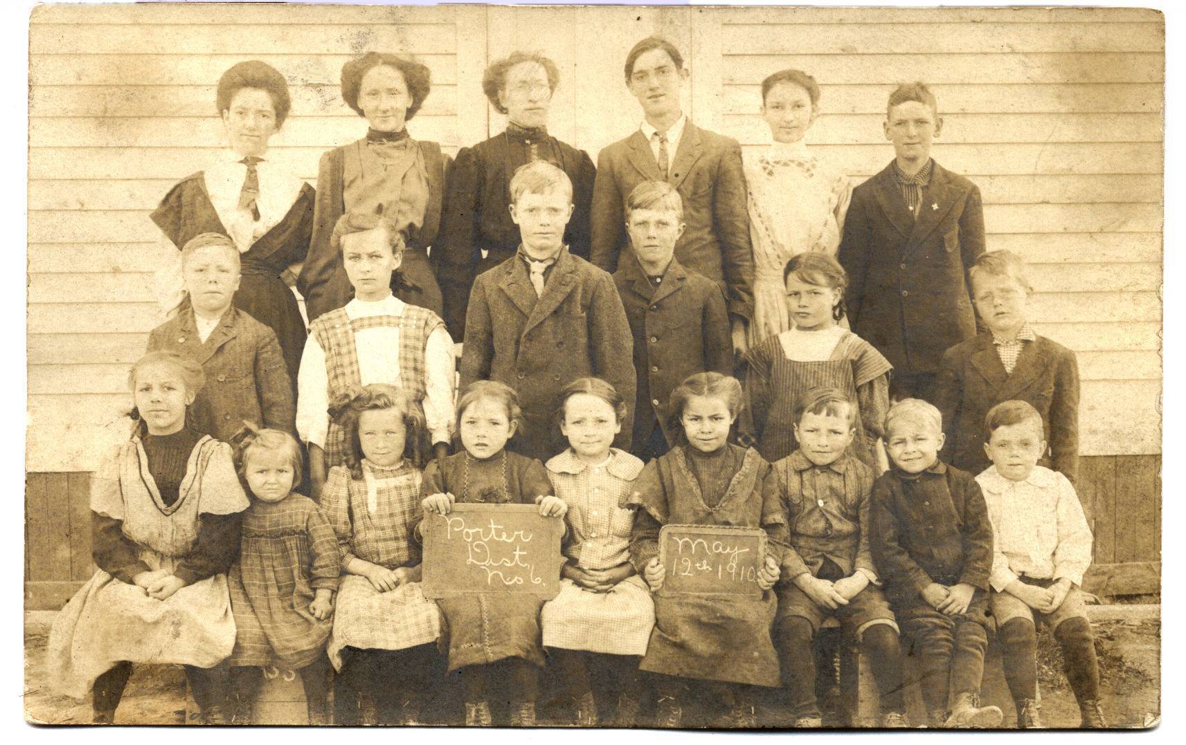 Rear row (l to r): Margie Tye, Maude Wales, Elizabeth Boyle (teacher), John Tye, Alma Tye, Jim Tye