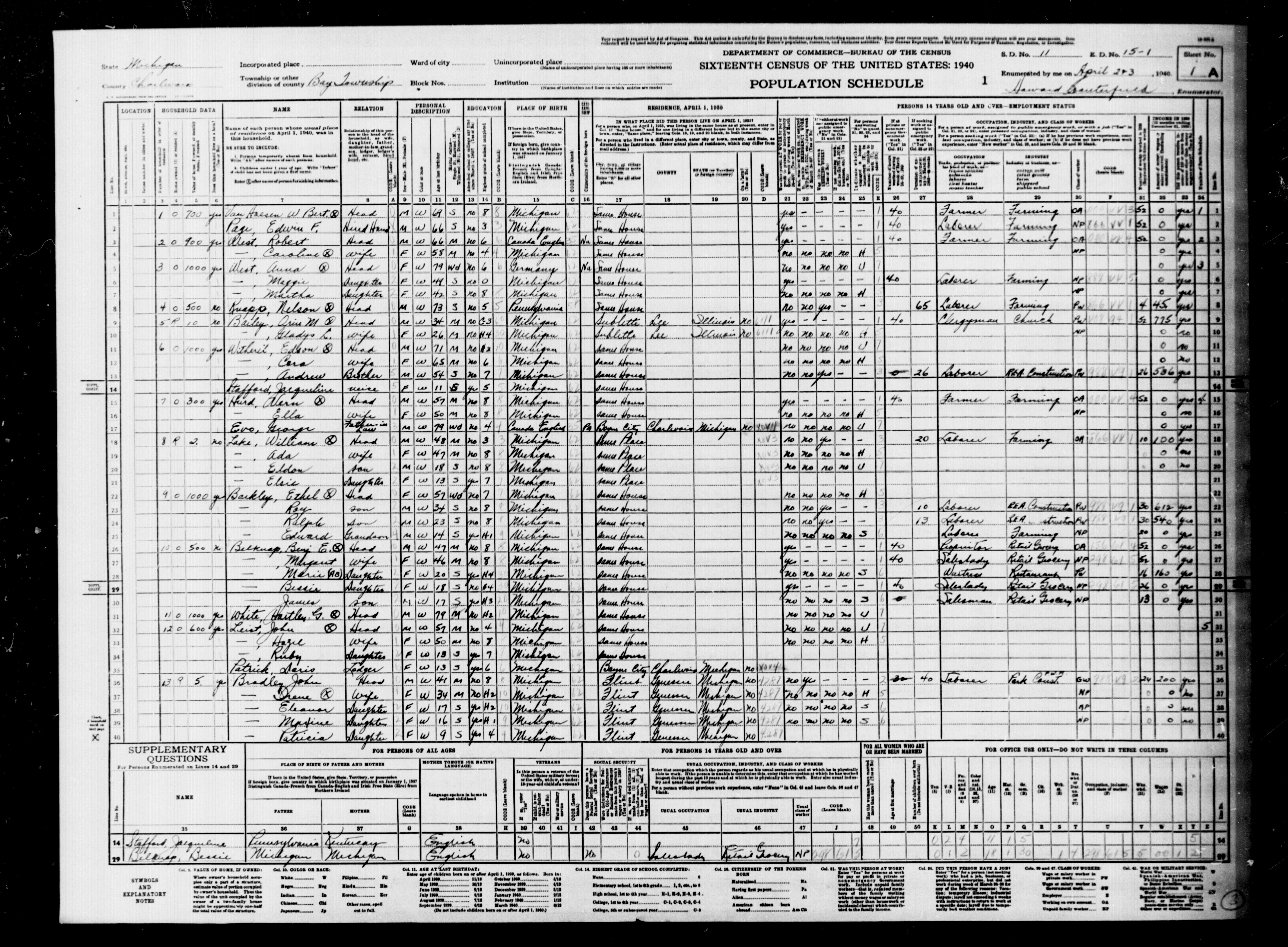 Hunt, Mrs Frank | Charlevoix | Bay Twp � � � | | 15-1 | 3B
