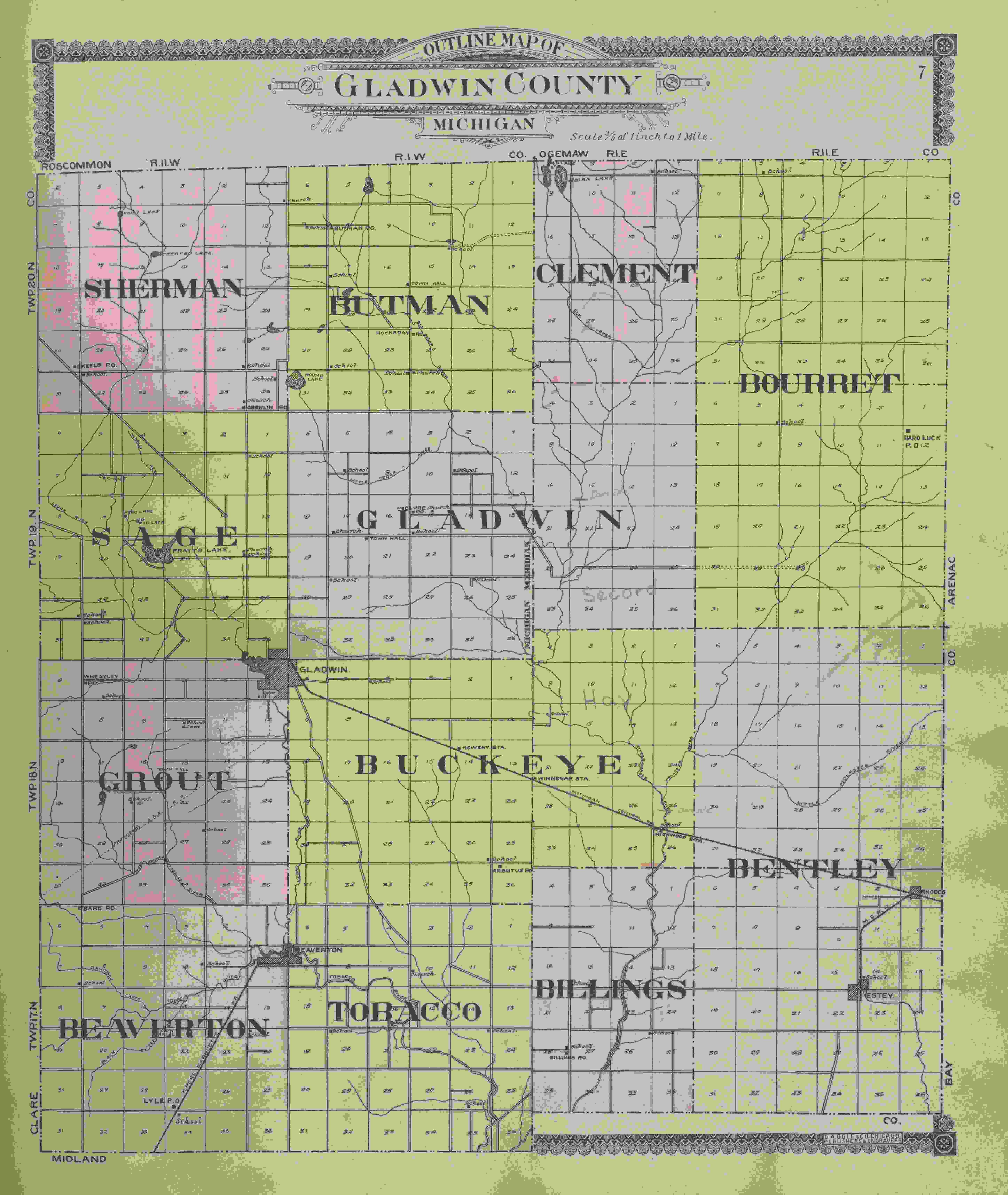 ![]() above: Gladwin County highlighted in a current map of Michigan. left: 1906 map of Gladwin County, showing townships |