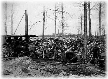 Sawing lumber on Will Hetzman farm, 2 miles east and 1/2 mile north of Beebe, MI. Pictured are C.W. Conklin, Frank Conklin,
