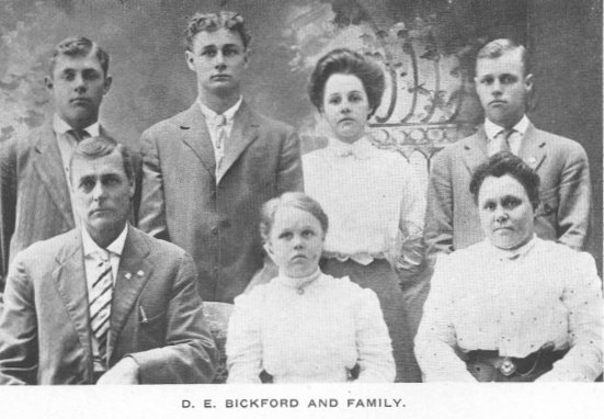 Devillow Ellsworth Bickford, youngest son of Joseph and Rhoda Bickford, was born in the State of New York, November 25, 1862. When a young boy he came with his parents to Gratiot, and did his share in clearing up and cultivating the new farm. Being the youngest of the children and the only one at home during his father’s declining years, he was the chief support and mainstay of the widowed mother after his father’s death.