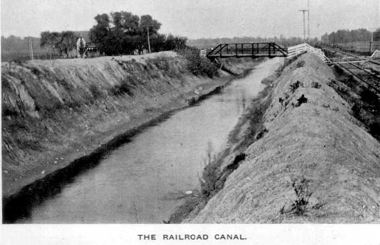 The illustration shows the big ditch, or Maple River cut-off, near Bannister, constructed by the Ann Arbor Railroad Company along the west side of its track, across the ox-bow bend of the river, to serve for quick delivery